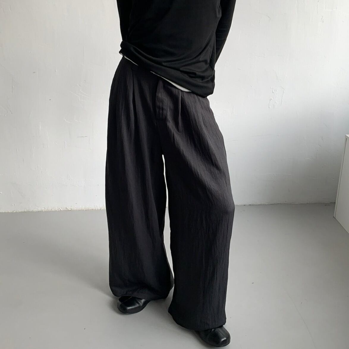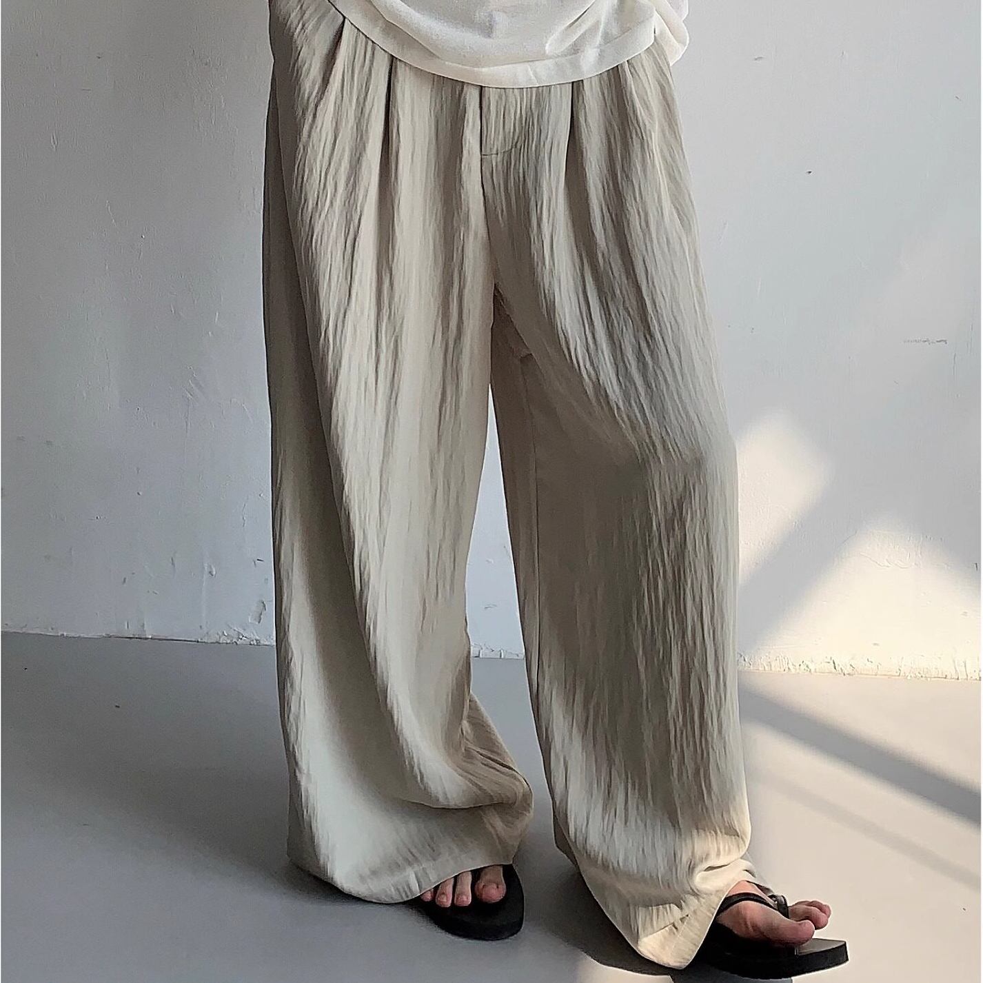 脚長効果が期待できるワイドシルエット。